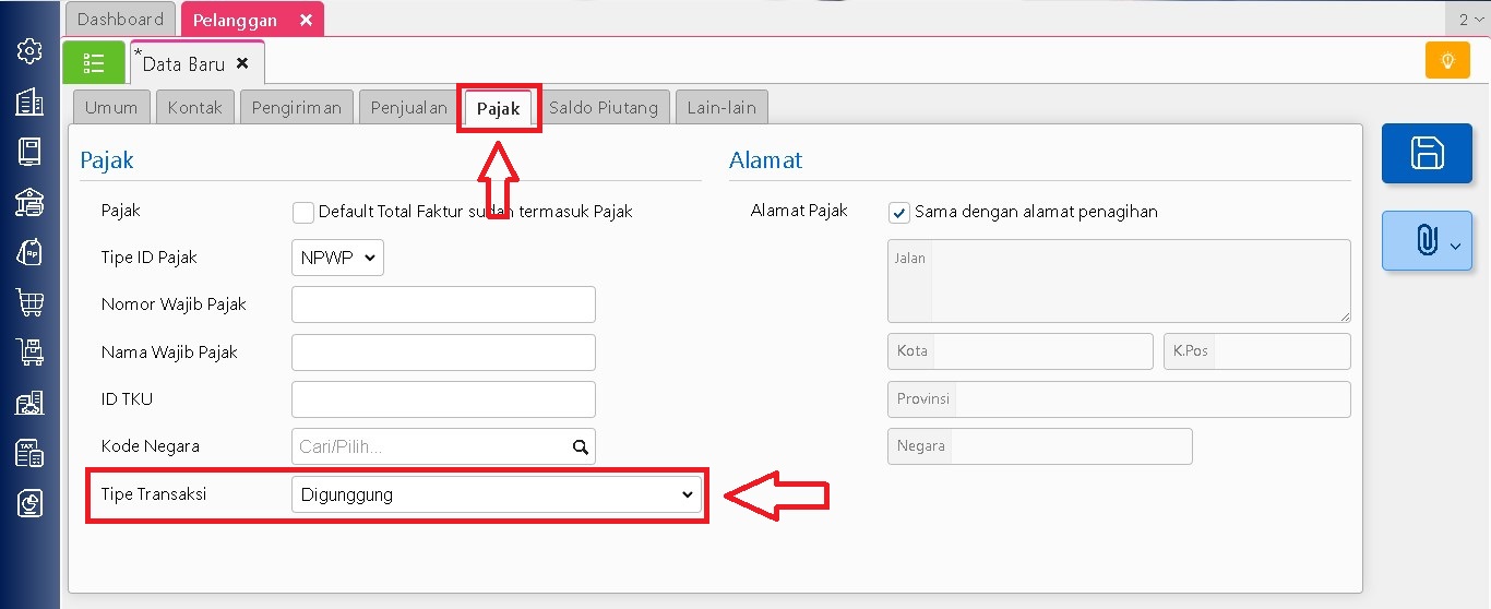 - Pada tab Pajak, tentukan Tipe Transaksi: Digunggung.