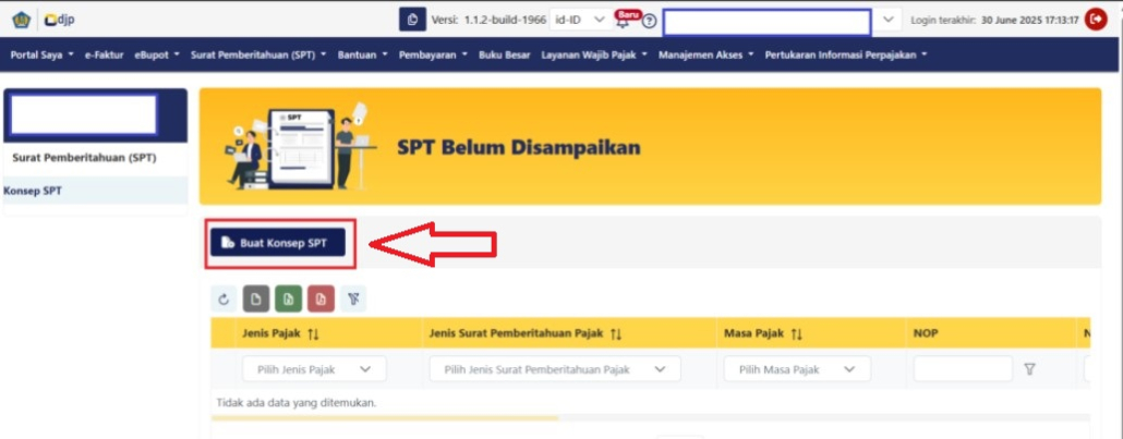 - Masuk ke menu Surat Pemberitahuan (SPT) dan klik Buat Konsep SPT.
