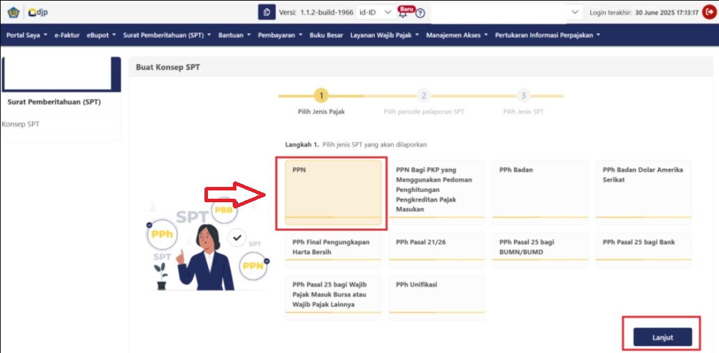 - Langkah 1: Pilih jenis SPT PPN, lalu klik Lanjut.