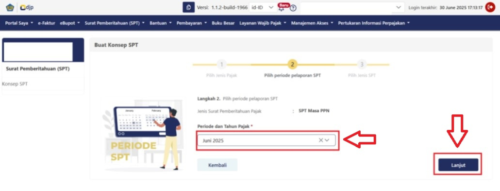 - Langkah 2: Tentukan Periode dan Tahun Pajak, kemudian klik Lanjut.