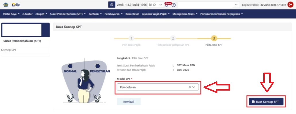 - Langkah 3: Pilih Modul/Jenis SPT, lalu klik Buat Konsep SPT.