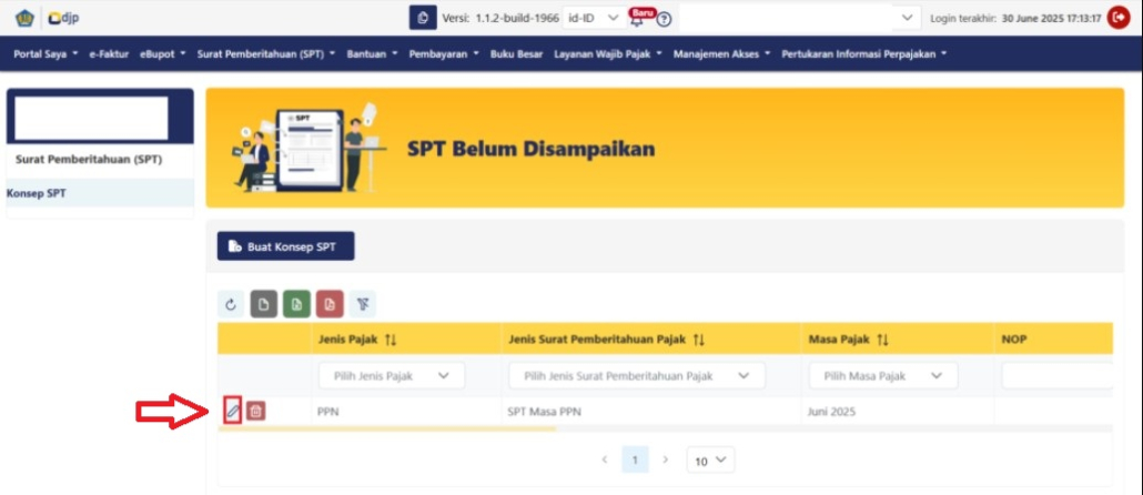 Pada daftar SPT, klik ikon pensil untuk membuka detail SPT Masa PPN yang telah dibuat.