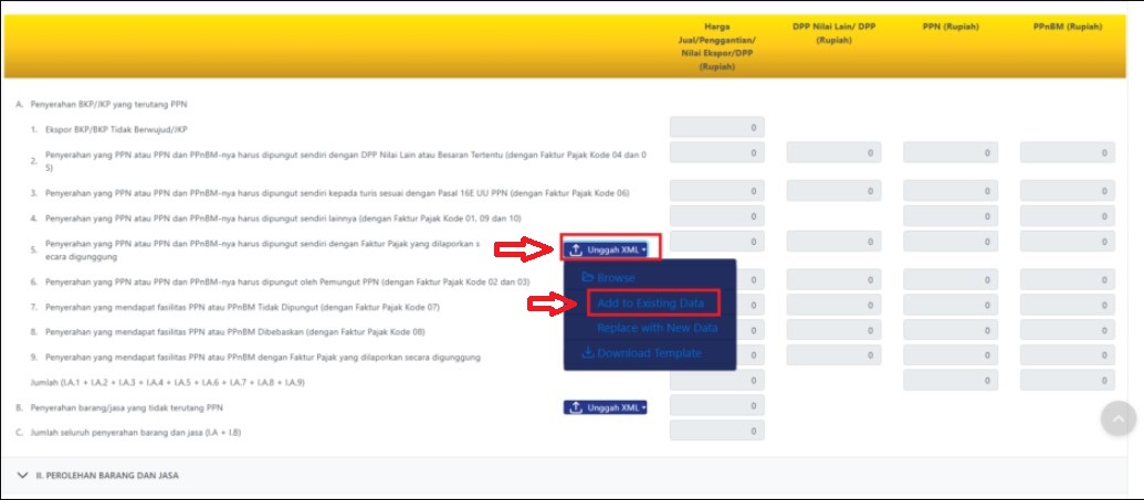 - Pada bagian unggah dokumen sesuai Kode Transaksi, klik Unggah XML.