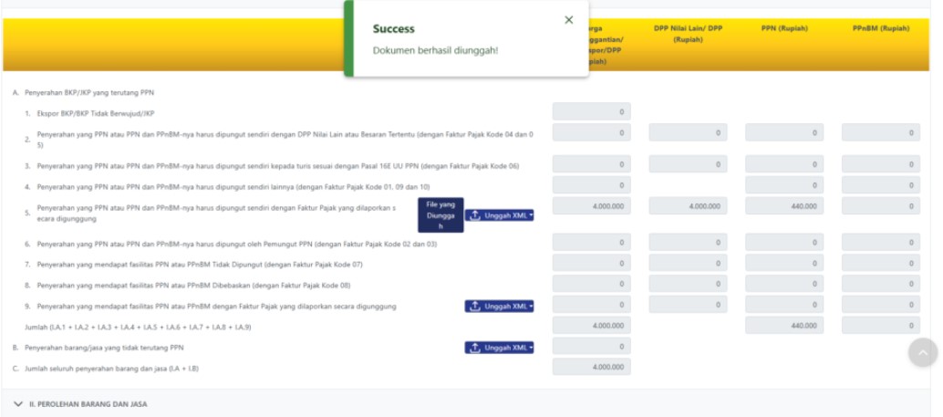 Jika unggah berhasil, sistem akan menampilkan notifikasi “Dokumen berhasil diunggah“. Setelah itu, pengguna dapat melengkapi data SPT dan memilih Simpan Konsep atau langsung Bayar dan Lapor.