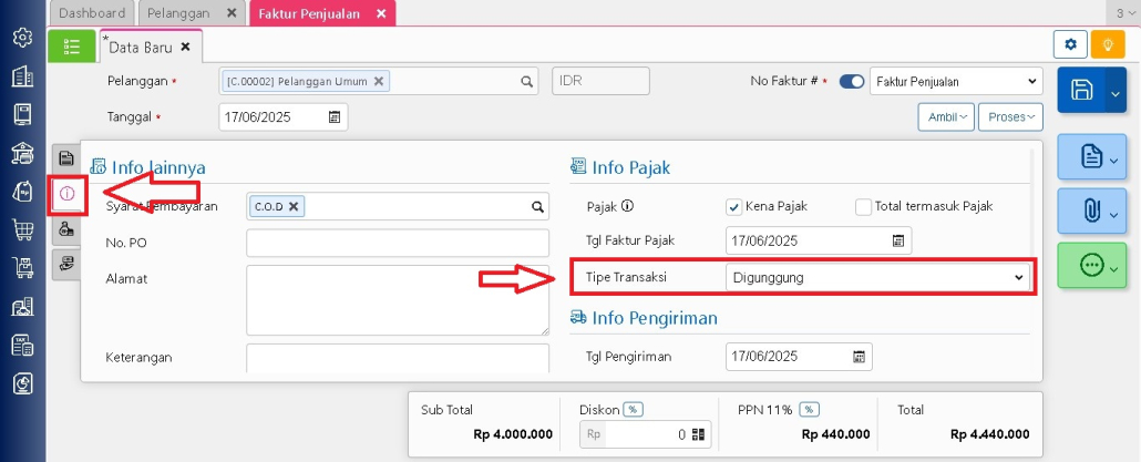 - Pada tab Info Lainnya – Info Pajak, pastikan Tipe Transaksi sudah diatur sebagai Digunggung.