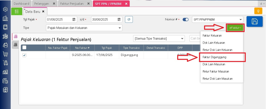 - Klik Data Baru, kemudian pilih menu efaktur – Faktur Digunggung.