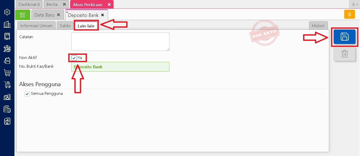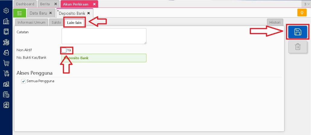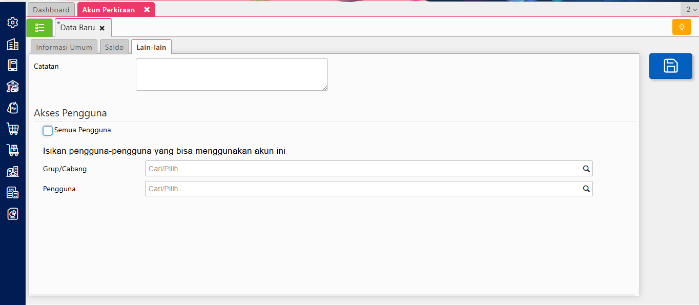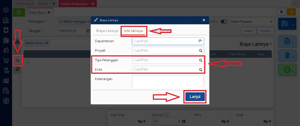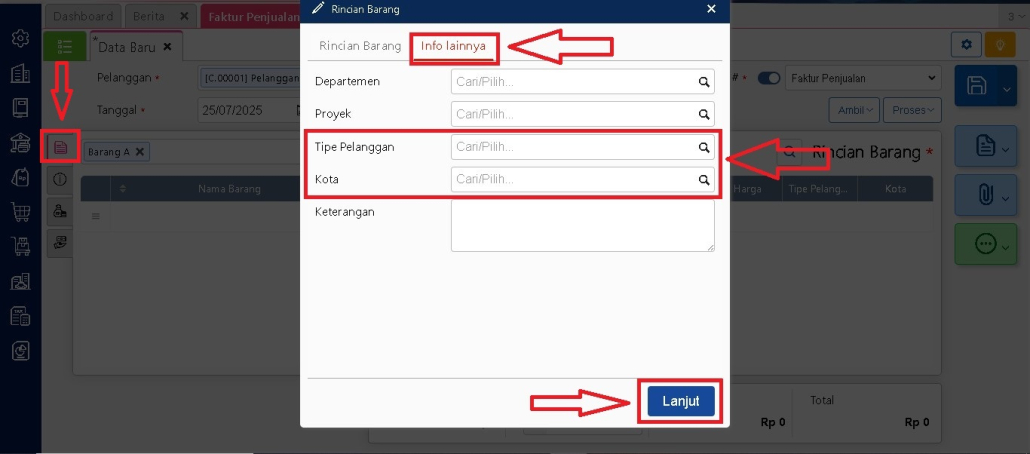 - Di tab ini, tersedia kolom Catatan yang bisa Anda gunakan untuk menuliskan keterangan tambahan. Selain itu, jika Anda menggunakan fitur Multi Cabang, Anda juga bisa memilih cabang mana yang terkait dengan transaksi tersebut.