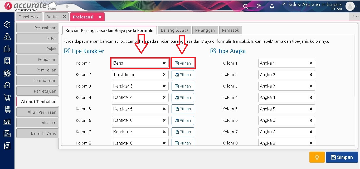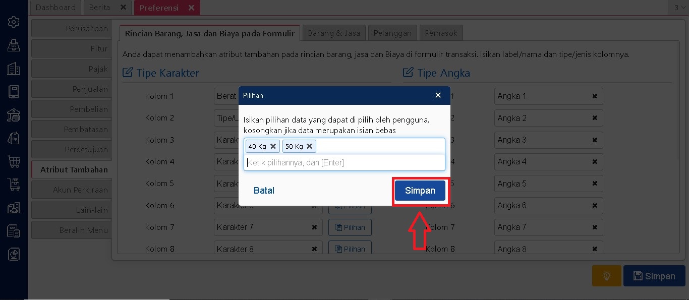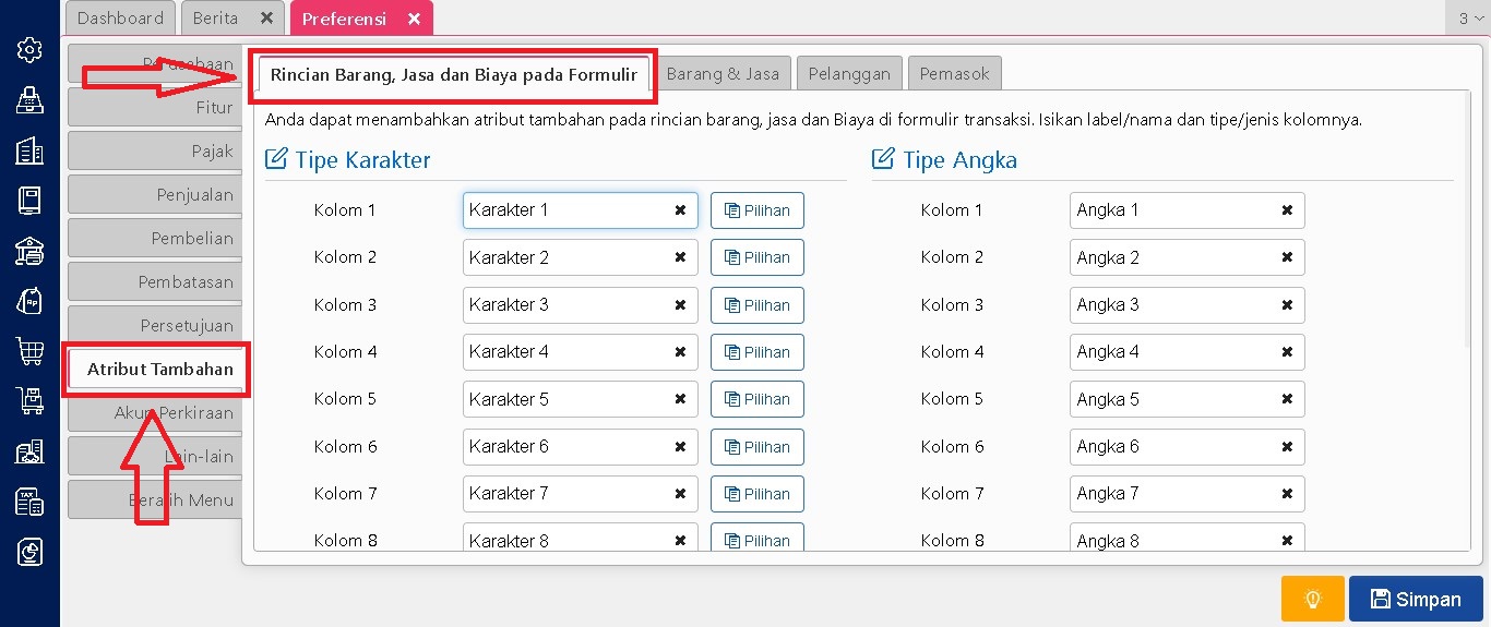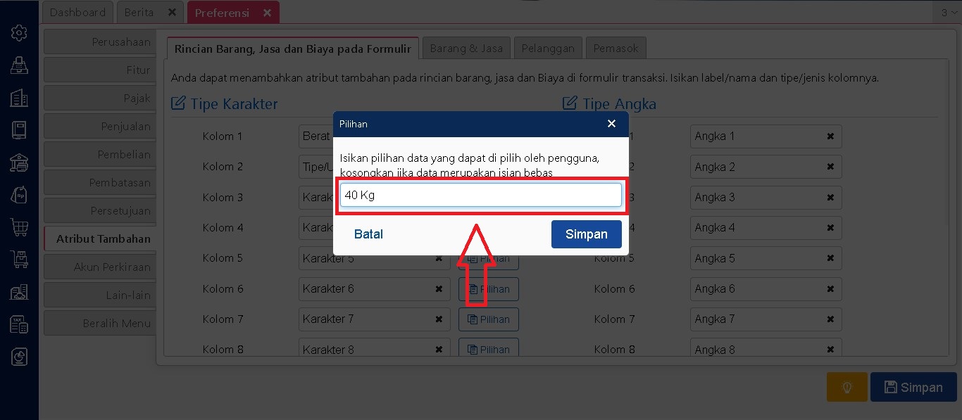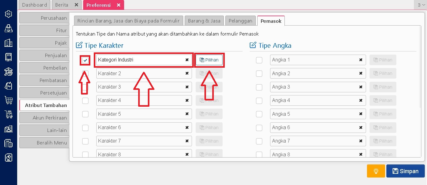 Setelah fitur atribut tambahan diaktifkan, pengguna dapat menetapkan nama serta jenis atribut yang akan digunakan. Jenis atribut yang tersedia meliputi karakter, angka, dan tanggal. Penentuan ini bisa disesuaikan dengan kebutuhan informasi tambahan yang diperlukan oleh perusahaan untuk masing-masing pemasok dan jika ingin dibuat pilihan dalam pengisian atribut tambahan anda dapat isi pilihannya pada kolom pilihan jika tidak menggunakan pilihan untuk kolom pilihannya dibiarkan saja.