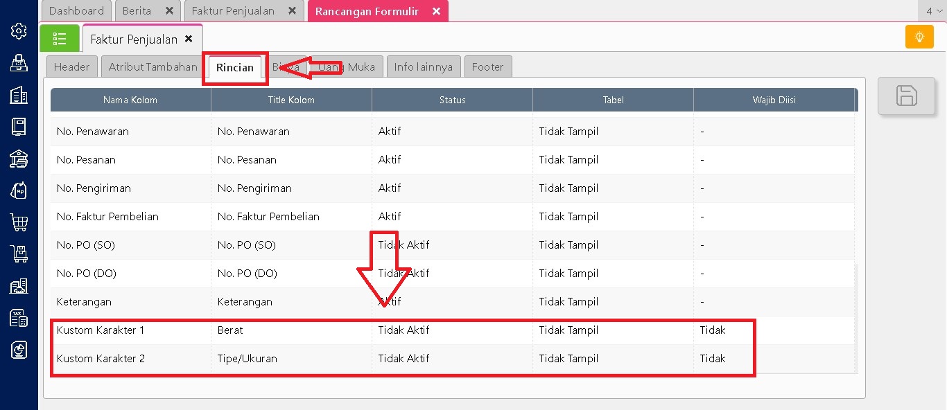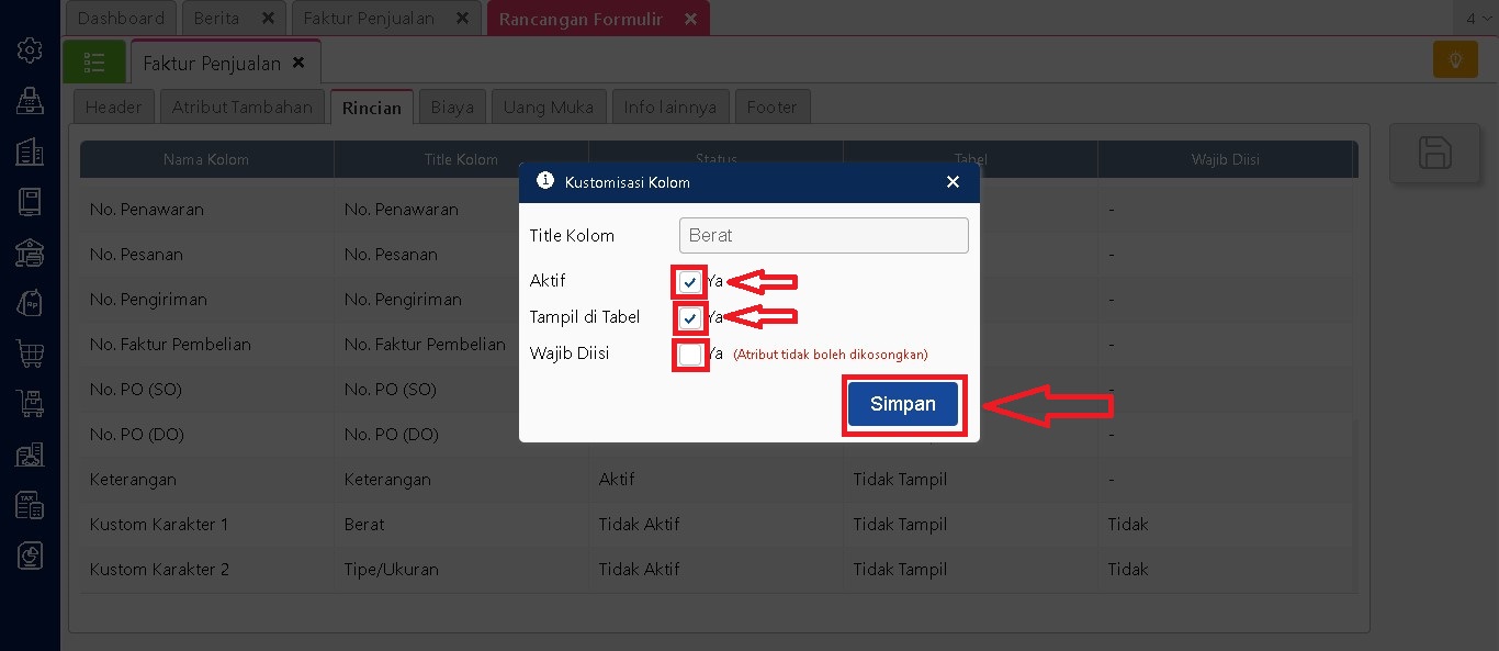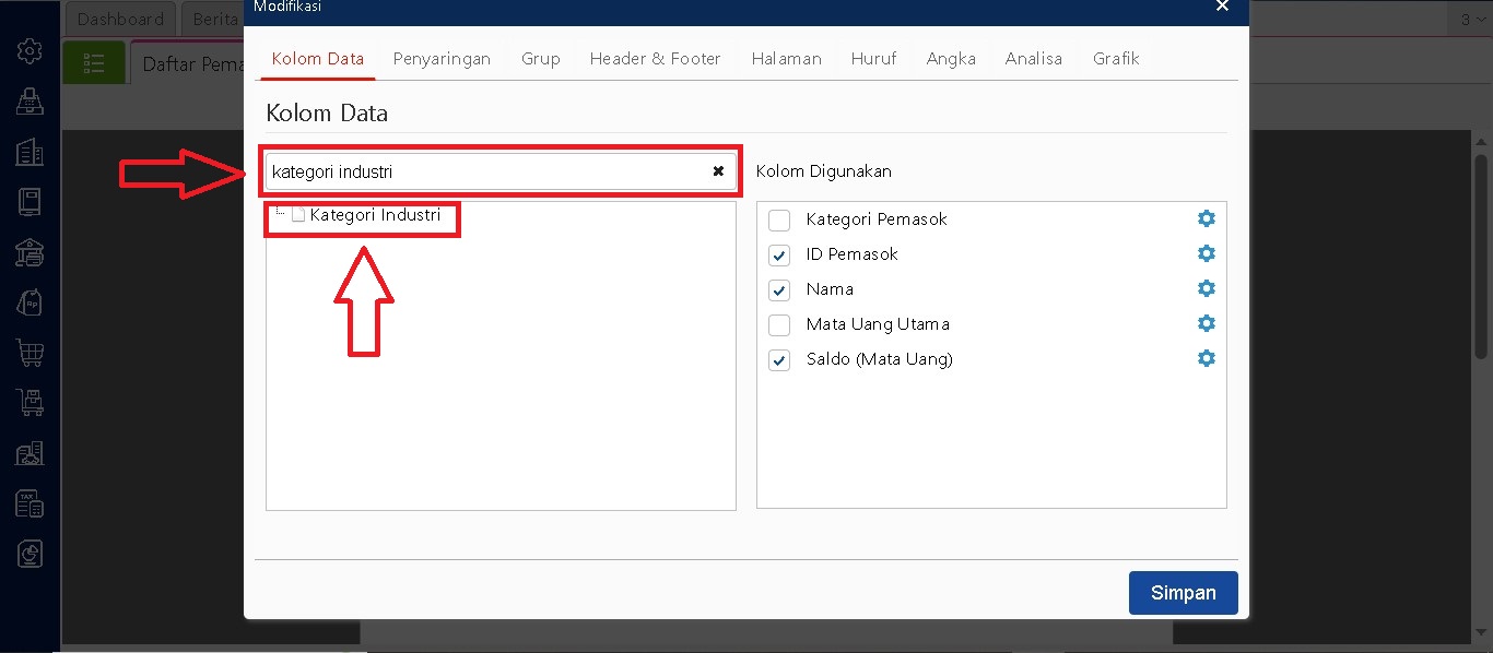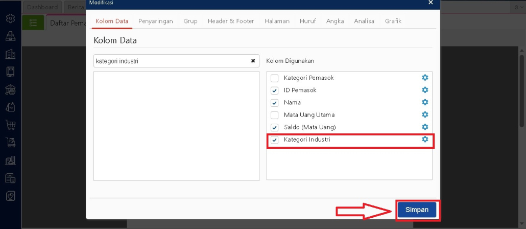 Masuk ke laporan yang ingin dimodifikasi, lalu buka menu Modifikasi. Di bagian Kolom Data, cari nama atribut tambahan yang sudah ditentukan sebelumnya. Klik dua kali nama atribut tersebut agar pindah ke bagian Kolom Digunakan. Setelah selesai, klik Simpan.