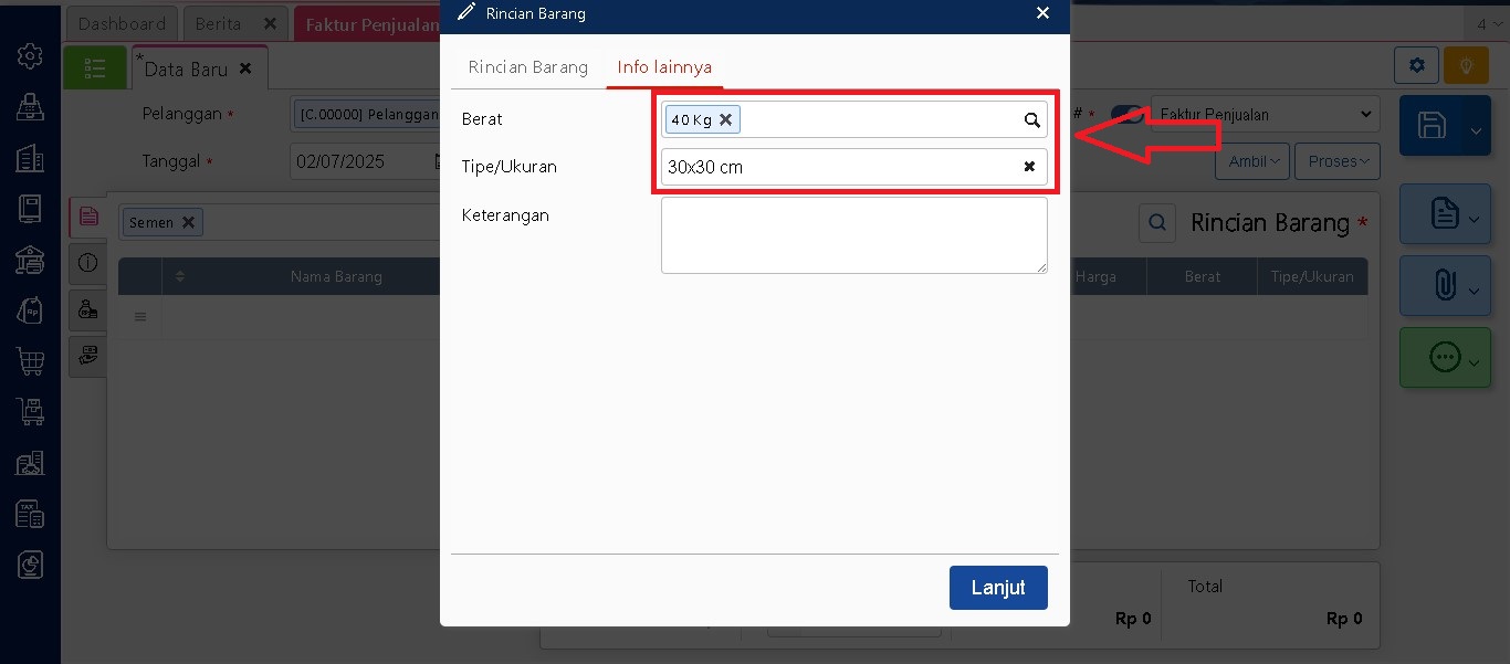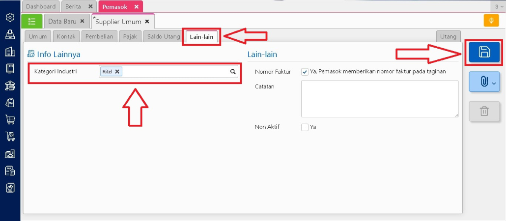 Di tab Lain-lain tersebut, pengguna bisa mulai mengisi masing-masing kolom atribut tambahan sesuai dengan data atau keterangan yang dibutuhkan pada pemasok tersebut, lalu disimpan.