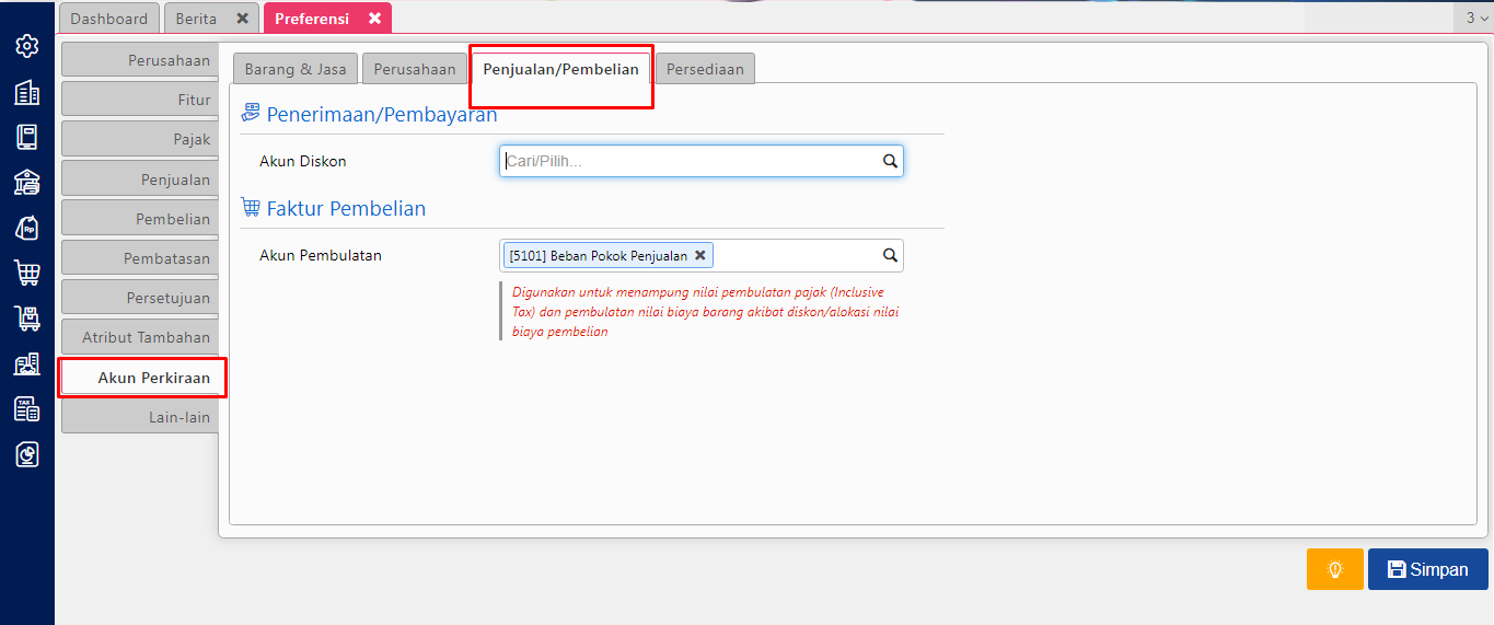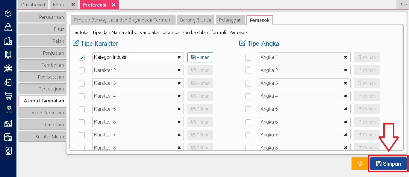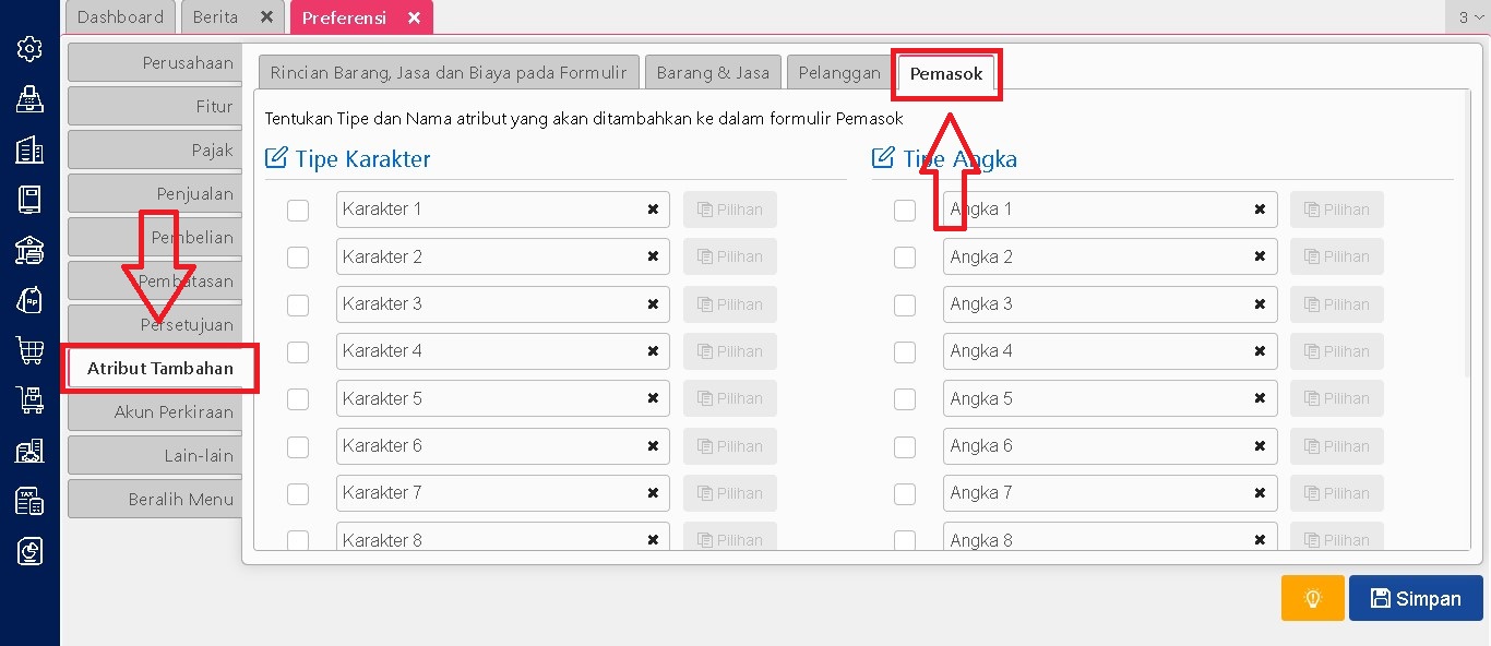 Langkah pertama dalam menggunakan atribut tambahan pemasok adalah dengan mengaktifkannya terlebih dahulu melalui menu Preferensi yang tersedia di Accurate Online. Menu ini memungkinkan pengguna untuk menentukan apakah tipe atribut tambahan akan digunakan atau tidak.