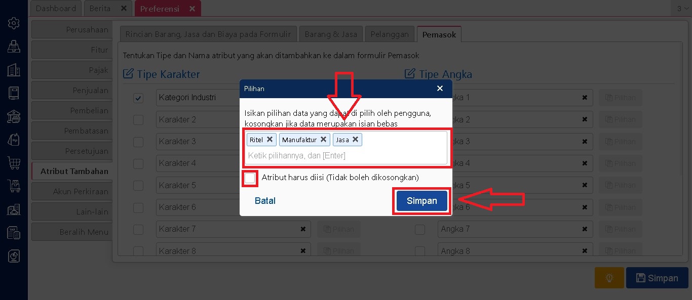 Jika membuat pilihan, isi pilihan sesuai ketentuannya, lalu jika atribut tambahan ini wajib diisi pada setiap pemasok ceklis kotak Atribut harus diisi, lalu simpan jika sudah