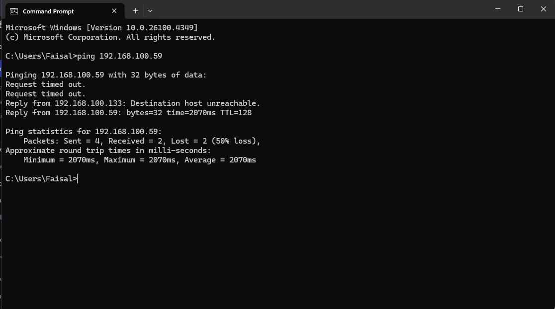 • test ping jaringan antar komputer server dan client, dengan cara ketikan IP server pada Command Prompt (CMD) dan pastikan status jaringan nya TTL. Jika hasilnya RTO seperti gambah maka kalian harus memastikan beberapa aspek di komputer server dan komputer client.