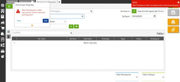 Saat menyimpan transaksi Penerimaan Penjualan atau Pembayaran Pembelian dan tampil pesan error “Nilai pembayaran tidak mencukupi untuk melunasi pembayaran”, hal ini dikarenakan belum meng-klik ‘Hitung Nilai Pembayaran’.