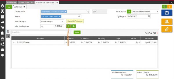 Dengan meng-klik ‘Hitung Nilai Pembayaran’, Accurate Online akan menampilkan total Nilai Pembayaran/Penerimaan pada kolom Nilai Pembayaran atas faktur-faktur yang dilakukan pembayaran di formulir transaksi Penerimaan Penjualan atau Pembayaran Pembelian tersebut.