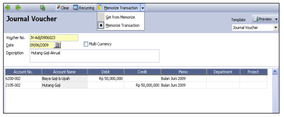 - Perhatikan, detail tabel Formulir Transaksi secara otomatis akan terisi sesuai dengan Memorize Transaction yang telah anda Copy.