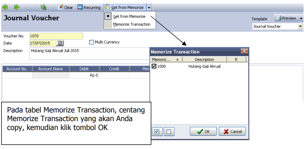 Memorize Transaction mempermudah anda dalam mencatat Formulir Transaksi baru yang detail informasi sama atau hampir sama dengan Formulir Transaksi baru yang sebelumnya telah anda buat. Detail yang telah anda salin dengan fitur Memorize Transaction dapat dengan mudah dicopy pada Formulir Transaksi yang baru dengan menggunakan Tombol Copy Transaction.