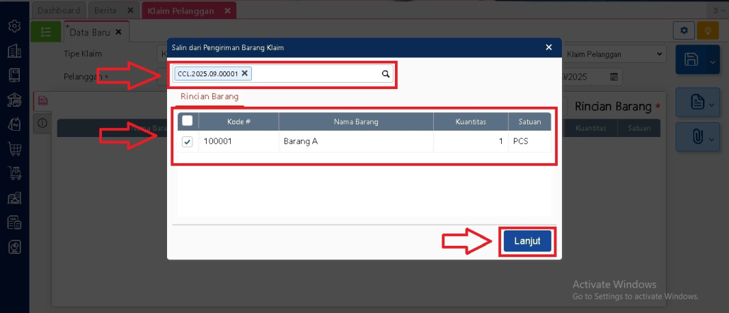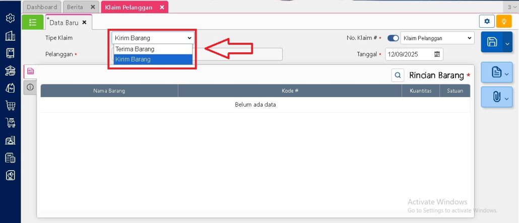 Buka menu Penjualan, lalu pilih Klaim Pelanggan. Pada halaman formulir, ubah opsi tipe klaim menjadi Kirim Barang. Dengan begitu, akan muncul kotak dialog khusus untuk memilih nomor klaim yang sudah pernah dicatat sebelumnya.
