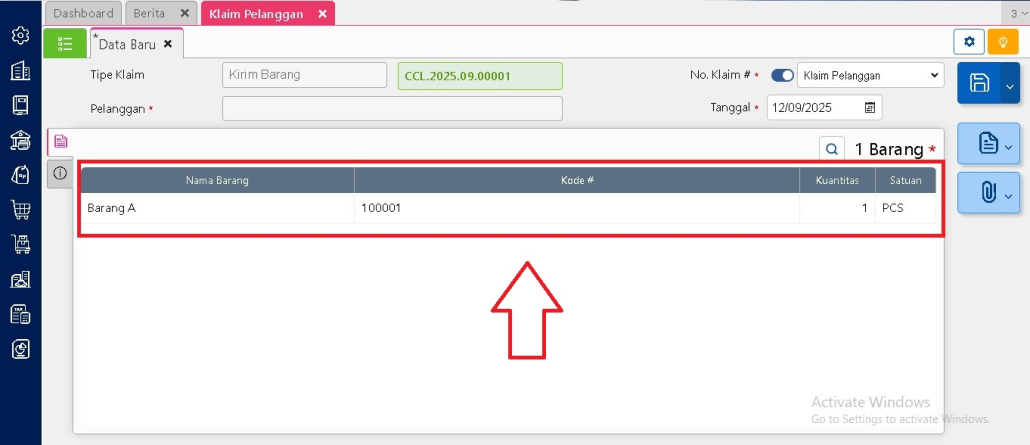 Cari dan pilih nomor klaim pelanggan yang ingin diproses. Nomor Klaim ini biasanya mengacu pada bukti klaim yang sudah diterima dari pelanggan. Setelah dipilih, sistem akan otomatis menampilkan data barang beserta jumlah unit yang diajukan dalam klaim tersebut.