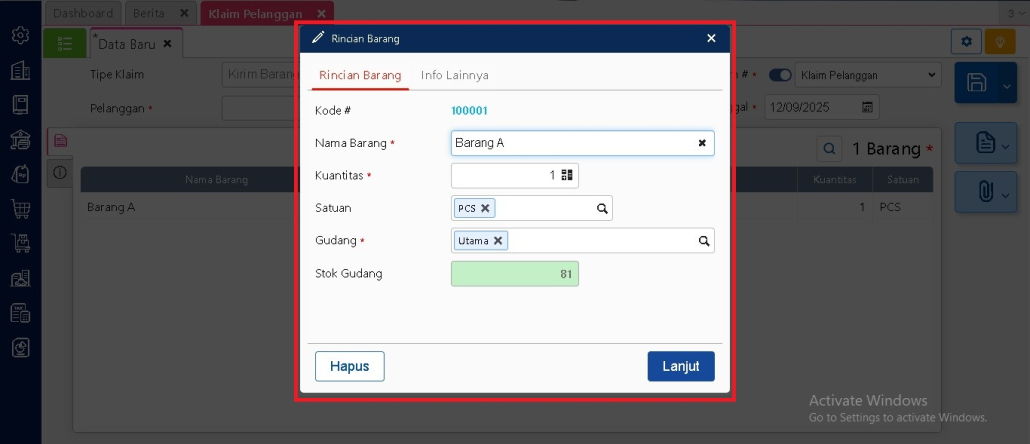 Setelah semua data dipastikan benar, klik tombol Lanjut. Sistem akan menyiapkan transaksi pengiriman barang pengganti sesuai klaim.