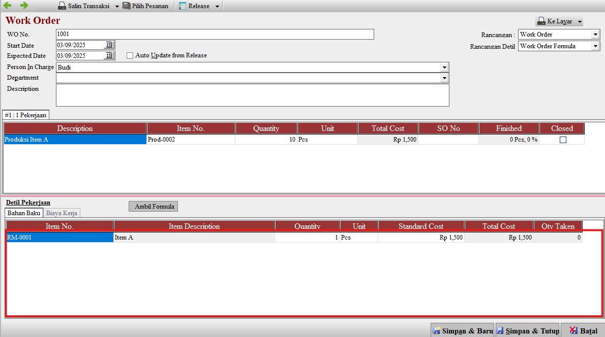 Saat membuat formula/BOM dengan memasukan item A (tanpa membuat standar item cost), maka nilai yang di ambil di Standar Cost nya adalah dari Last Actual Cost nya yaitu Rp. 1500.