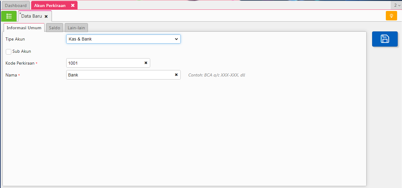 1. Buat terlebih dahulu akun yang akan dijadikan sebagai akun induk, seperti biasa melalui menu Buku Besar > Akun Perkiraan. Lengkapi informasi yang dibutuhkan (kode akun, nama akun, tipe akun, dll), lalu simpan.