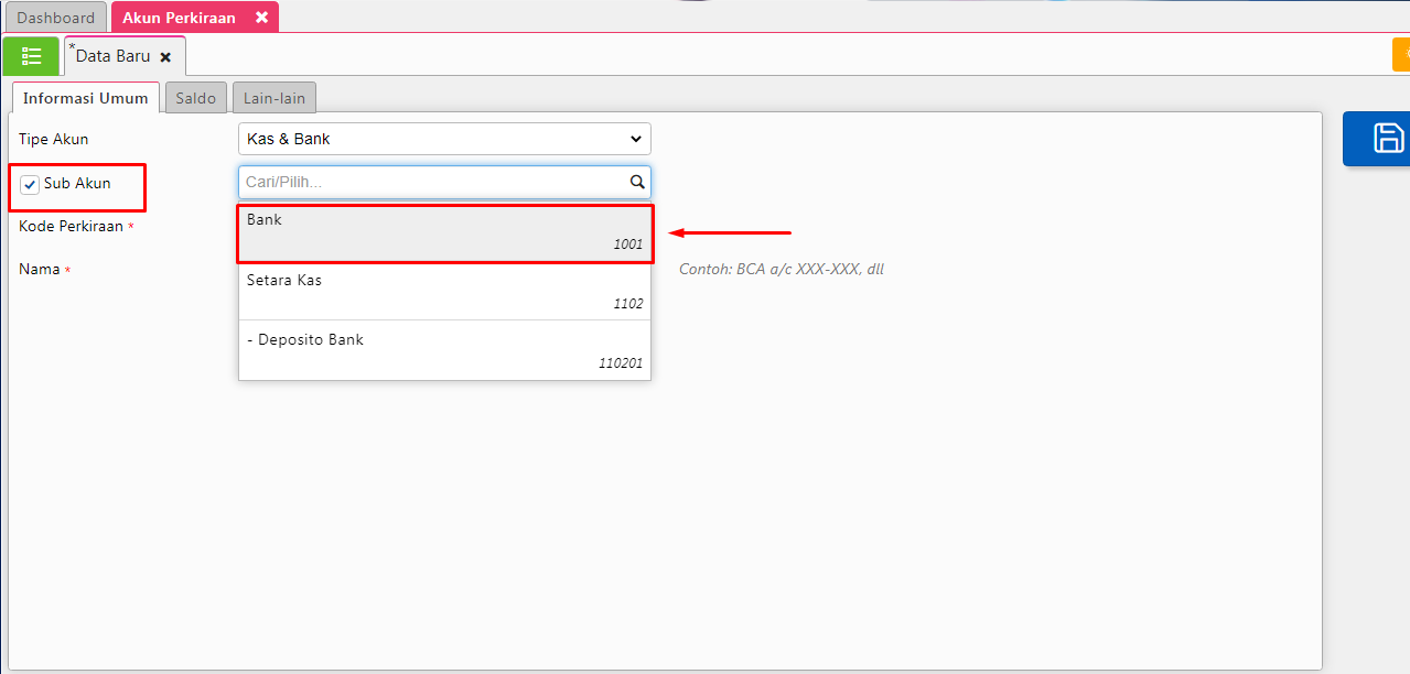 2. Selanjutnya, buat akun lain yang akan dijadikan sebagai anak dari akun induk tersebut. Proses pembuatannya sama seperti membuat akun biasa, tapi di bagian ‘Sub Akun’, pastikan kamu mencentang opsi untuk menjadikan akun ini sebagai bagian dari akun induk.