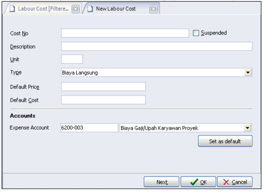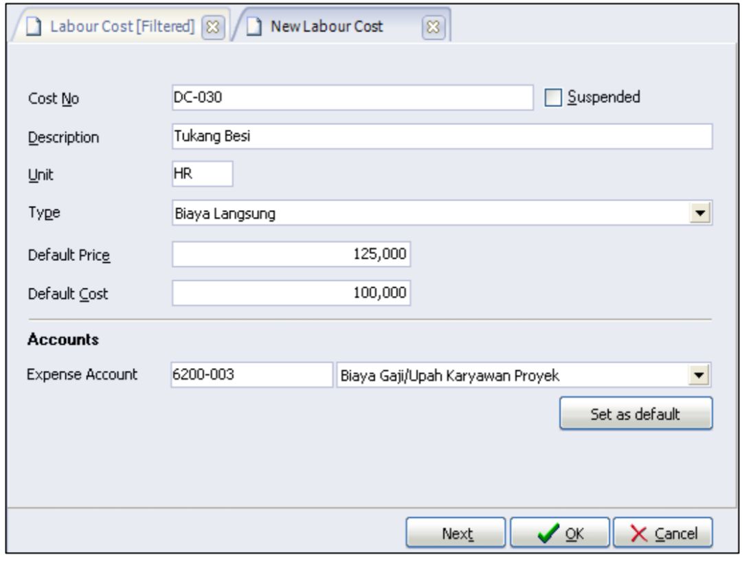 3. Setelah semua isisan formulir New Labour Cost anda lengkapi, langkah selanjutnya klik tombol ‘OK’ untuk menyimpan Labour Cost yang telah anda buat atau klik ‘Next [Berikutnya]’ jika anda akan melanjutkan pembuatan labour cost berikutnya.