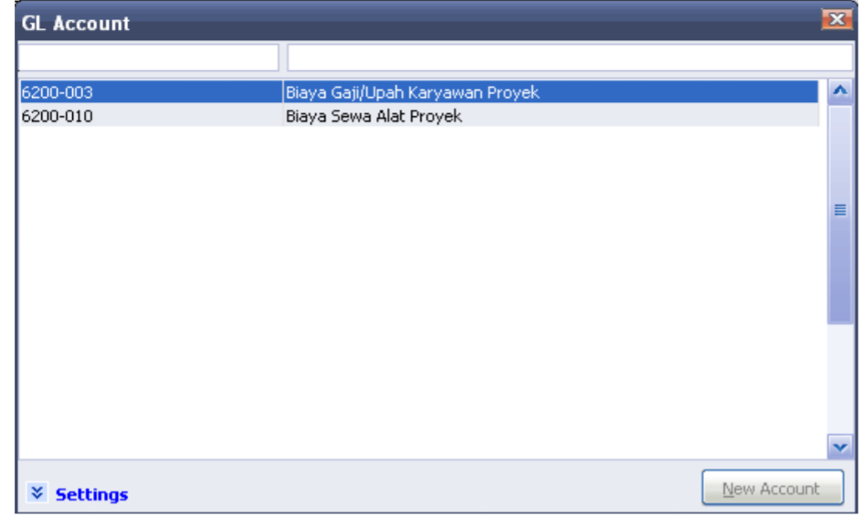 Kotak Dialog untuk memilih Akun Biaya Proyek