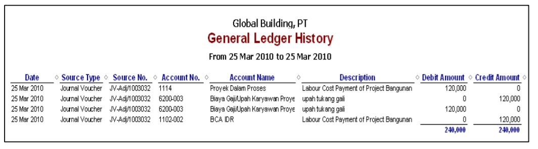 Pengaruh aktifitas Expense Payment pada posisi Keuangan Perusahaan dapat anda lihat dari menu utama List – General Ledger – Account History.