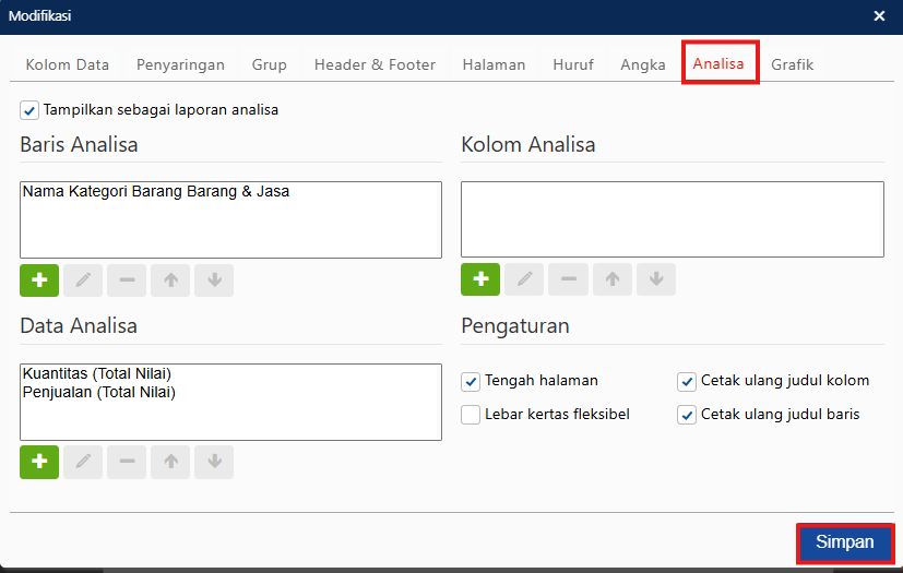 - Klik analisa, masukan kategori barang pada kolom analisa, lalu data analisa anda dapat memasukan kunantitas dan Penjualan, lalu klik simpan.