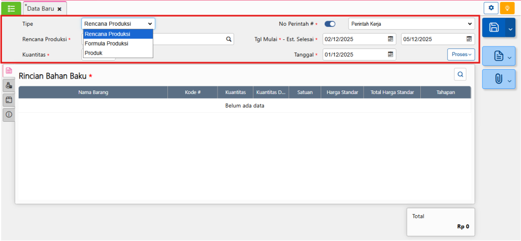 - Pada rincian bahan baku akan otomatis terisi sesuai dengan formula produk jika anda memilih tipe rencana produksi atau formula produksi, sedangkan jika untuk produk anda perlu mengisikan rincian bahan baku yang digunakan secara manual.