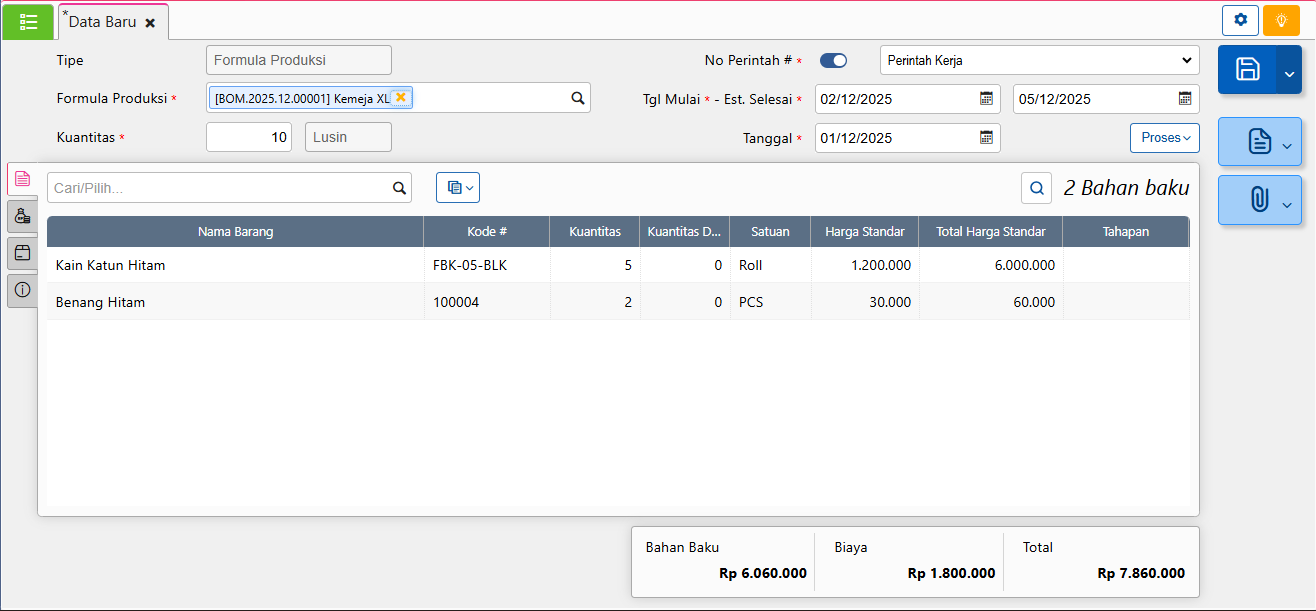 Note: Anda juga masih bisa menambahkan atau mengurangi bahan baku lain diluar dari formula, pada surat perintah kerja ini.