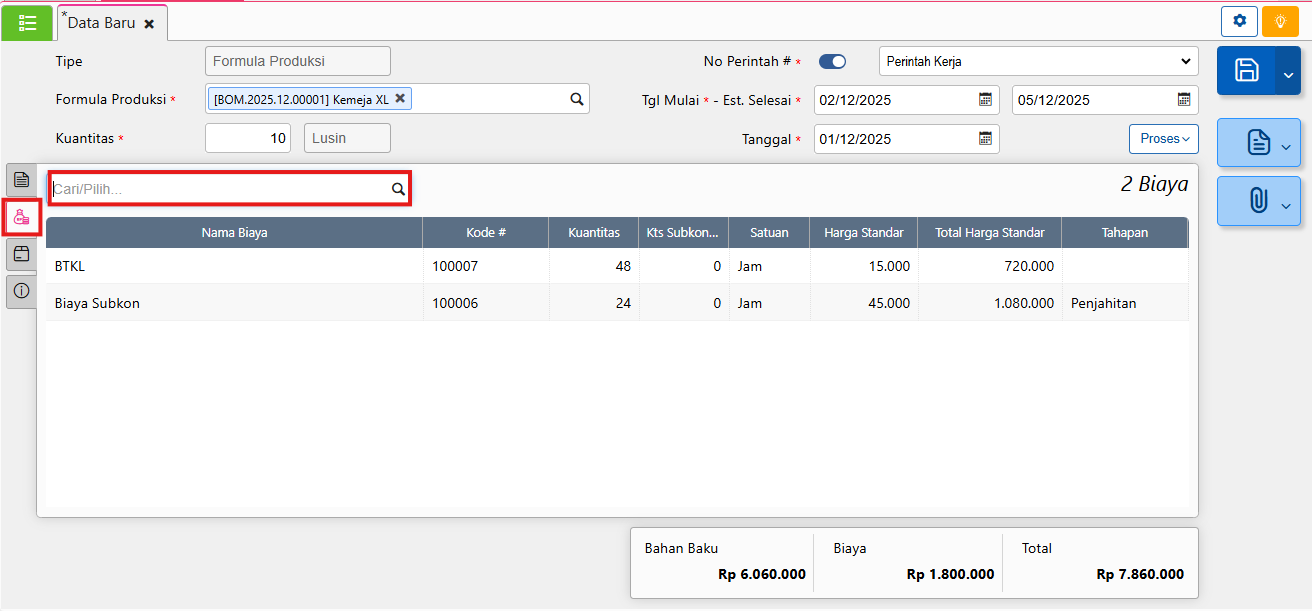 - Pada tab biaya produksi sama hal nya seperti bahan baku, akan terisi otomatis sesuai formula dan anda juga bisa menyesuaikan biaya yang diperlukan dalam surat perintah kerja ini.
