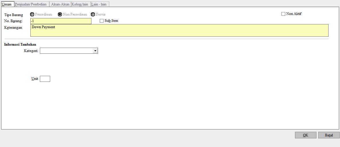 - Kemudian pada bagian Item Description, isikan Down Payment, lalu klik OK.