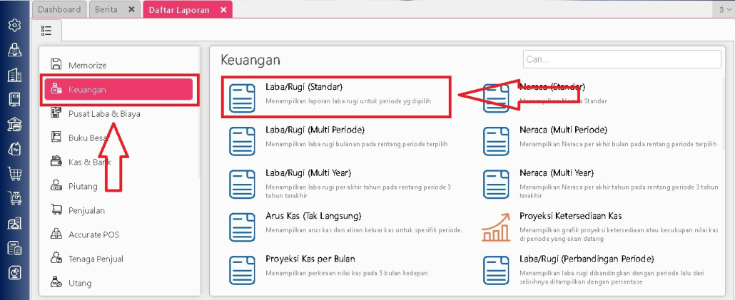 - Buka menu Daftar Laporan | Daftar laporan | Keuangan, lalu pilih laporan Neraca atau Laba/Rugi. Pada contoh ini digunakan laporan Laba/Rugi.