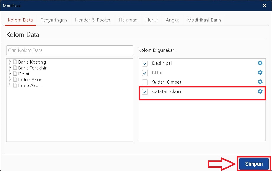 - Pada bagian Kolom Data, cari variabel Catatan Akun, lalu klik dua kali hingga variabel tersebut berpindah ke kolom Digunakan.