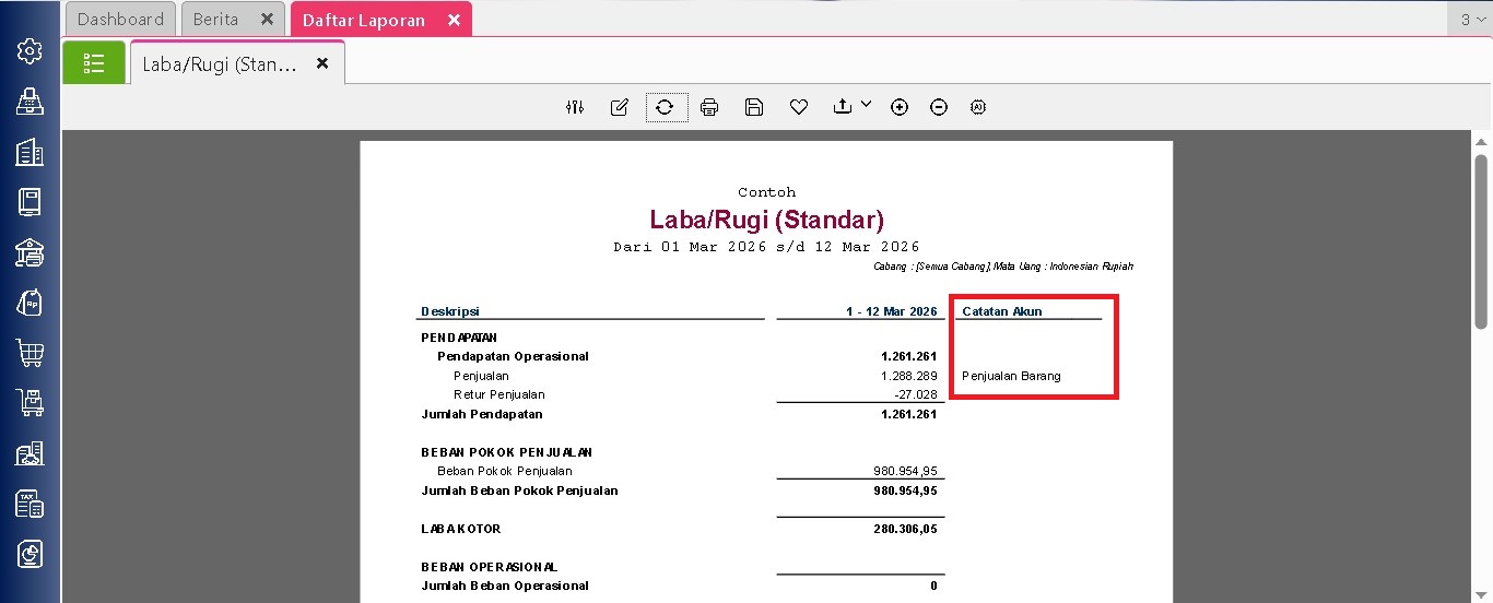 Setelah pengaturan tersebut dilakukan, laporan akan menampilkan Catatan Akun pada setiap akun yang memiliki keterangan tambahan. Dengan begitu, pengguna dapat melihat informasi tambahan terkait akun langsung dari laporan Neraca atau Laba/Rugi.