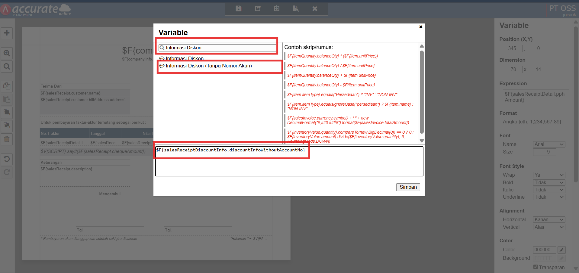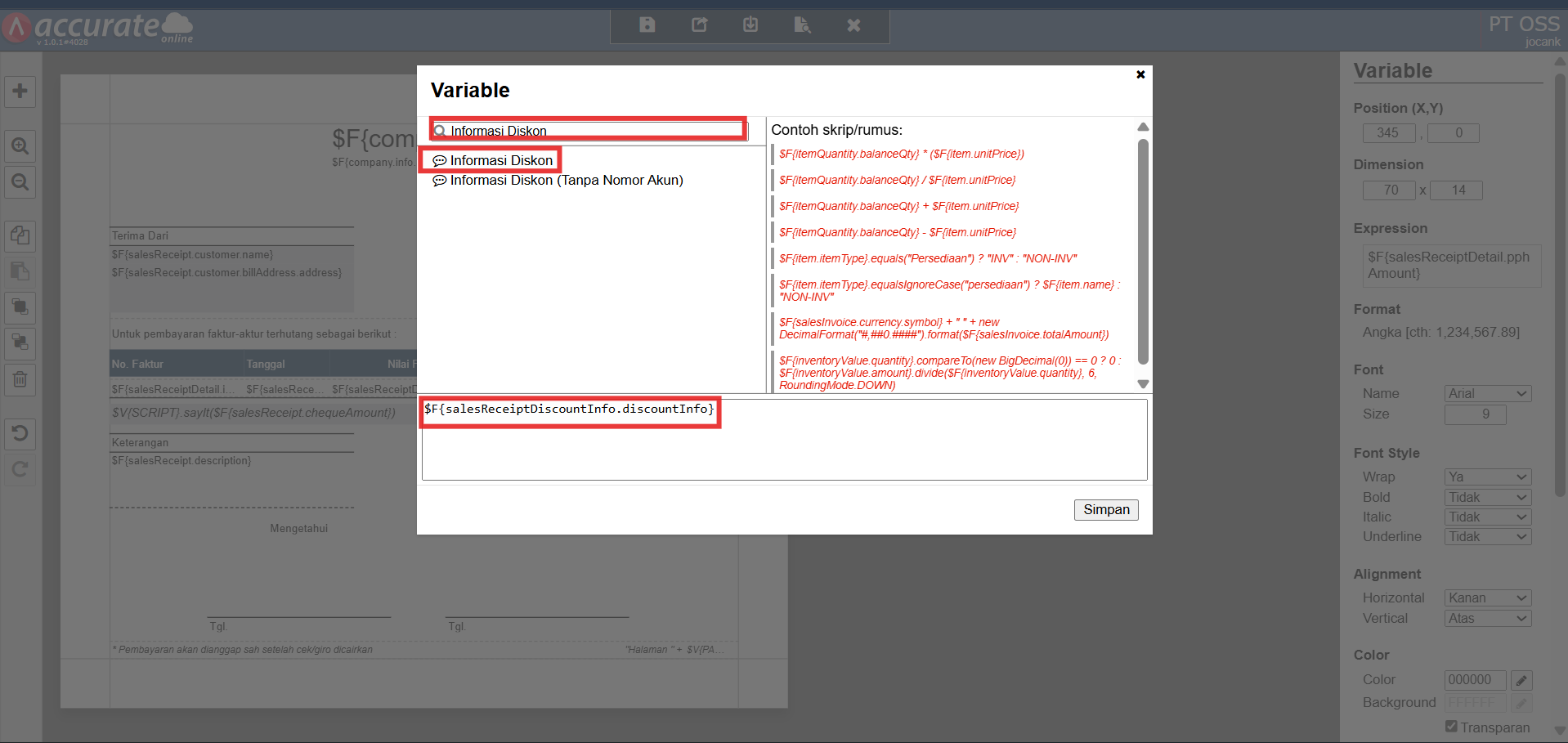 4. Sesuaikan Kolom informasi diskon pada desain. Lalu cari variable informasi diskon, jika memilih variable sesuai dengan gambar maka hasil nya akan seperti gambar di bawah (ada nomor COA).