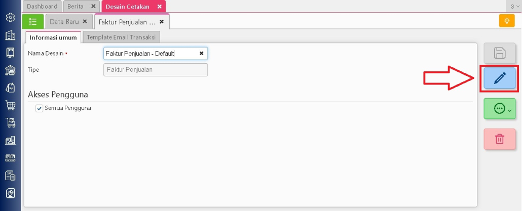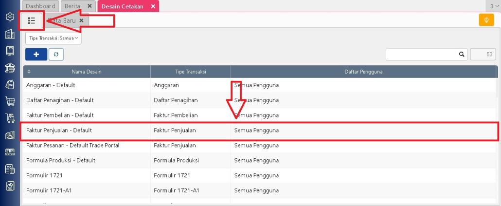 Masuk ke menu Pengaturan -> Desain Cetkan -> Daftar Desain Cetakan, lalu pilih desain faktur penjualan yang ingin digunakan.