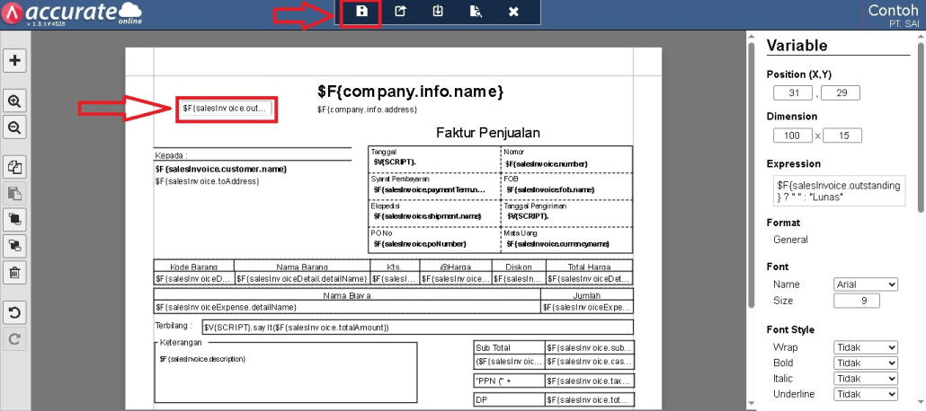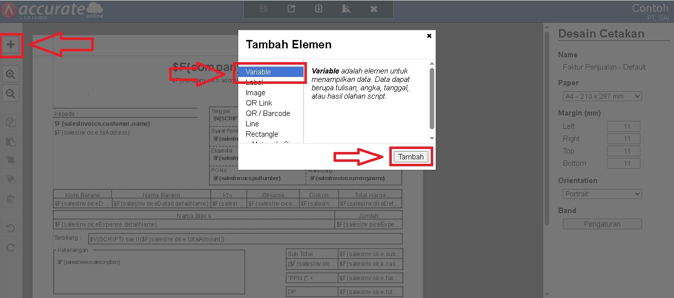 Di dalam desainer, tambahkan elemen variabel dengan menekan tombol (+), kemudian posisikan sesuai kebutuhan pada layout faktur.