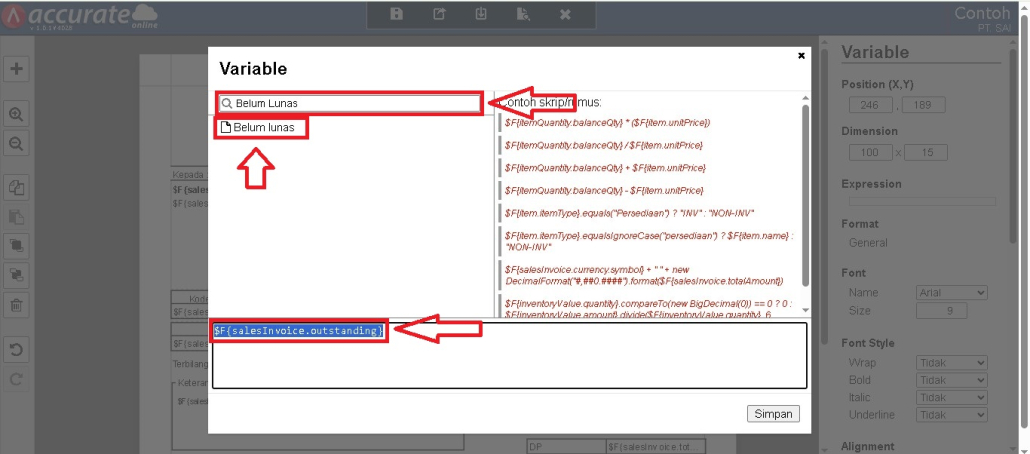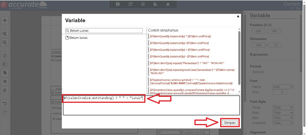 Klik dua kali pada variabel yang baru ditambahkan, lalu pilih variabel Belum Lunas. Tambahkan skrip kondisi di samping variabel tersebut agar dapat menampilkan status pembayaran. Gunakan rumus berikut: