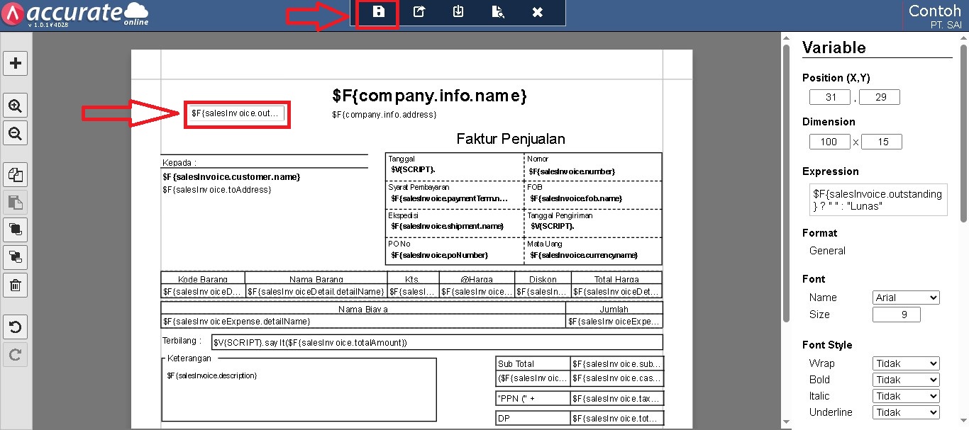 Untuk menampilkan keterangan “Lunas” pada hasil cetak Faktur Penjualan yang sudah dibayar, Anda bisa melakukan penyesuaian pada ddesain cetakan. Berikut langkah-langkahnya: