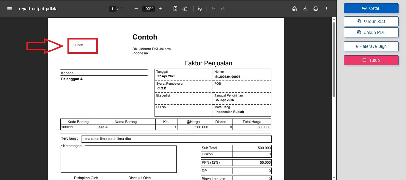 Terakhir, simpan perubahan desain cetakan. Setelah itu, saat Anda mencetak Faktur Penjualan yang sudah lunas, akan muncul keterangan “Lunas” pada hasil cetakan.