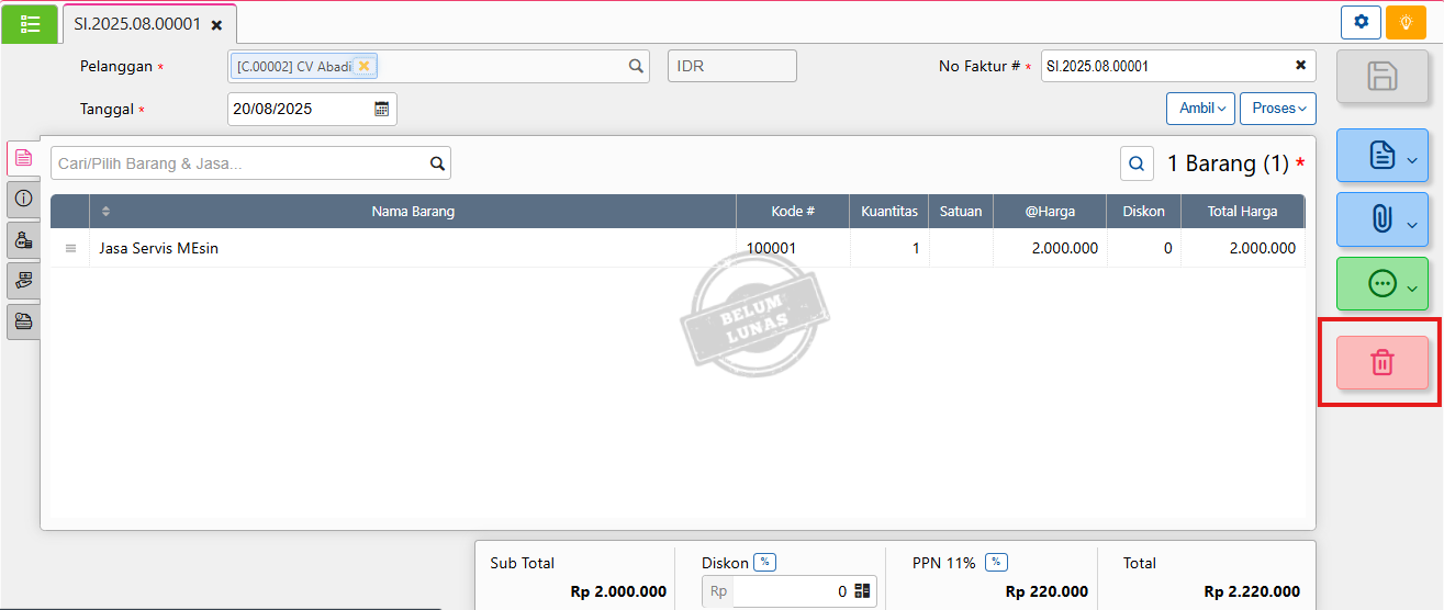 - klik list di pojok kiri atas, lalu buka faktur yang akan dihapus.