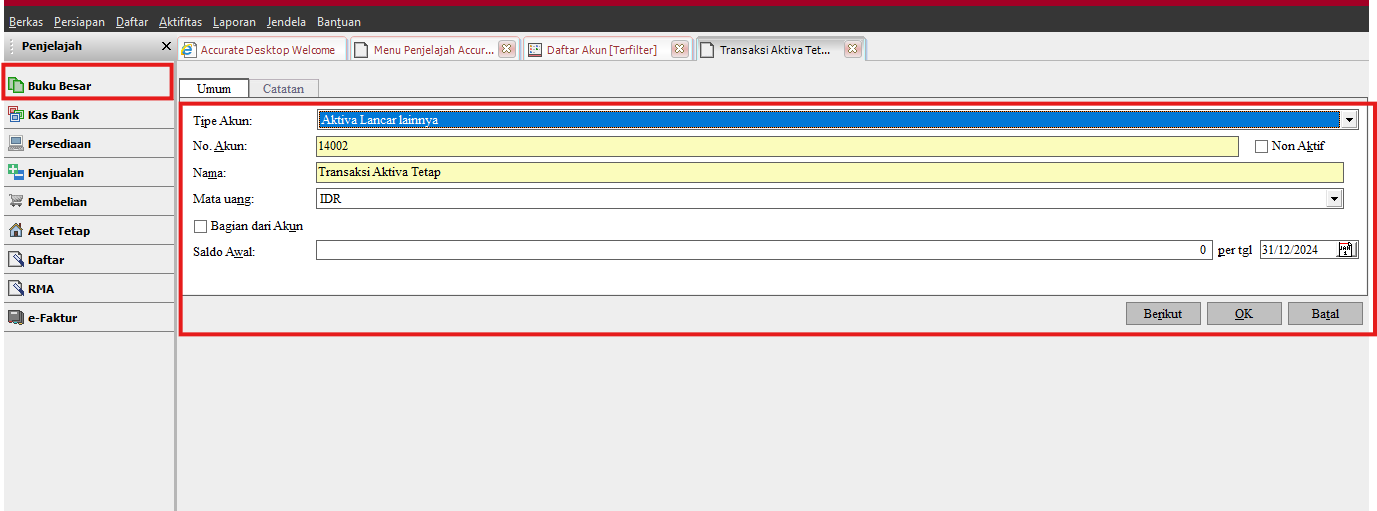 - Membuat Akun baru misalkan Fixed Asset Transaction dengan Tipe Other Current Asset.