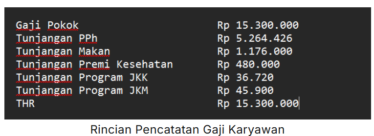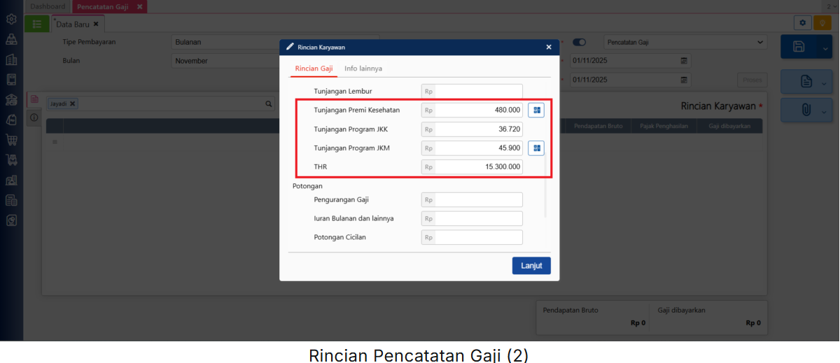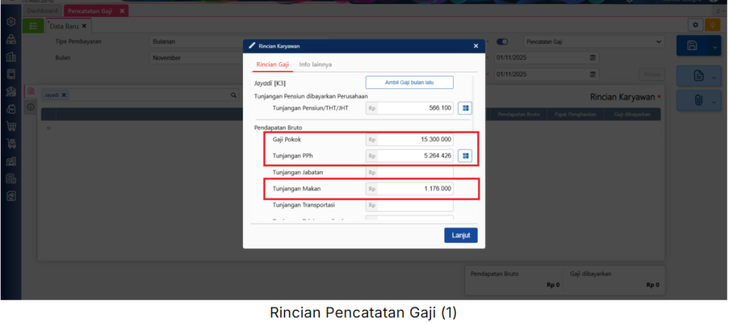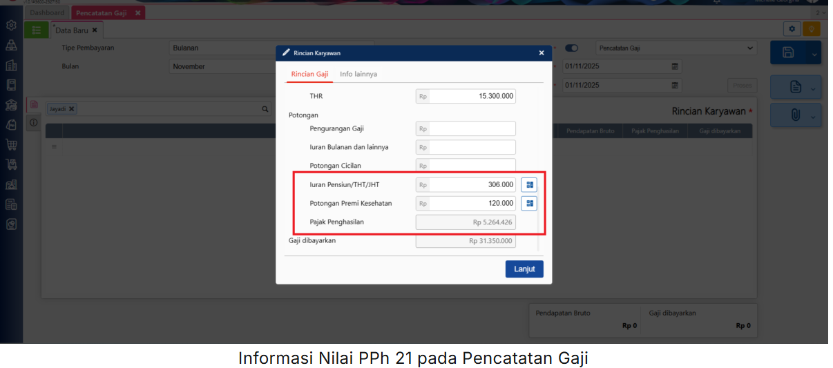 - Selanjutnya, lakukan pencatatan atas gaji karyawan dengan tunjangan pada menu Buku Besar | Pencatatan Gaji. Maka, Pajak Penghasilan (PPh 21) akan terhitung secara otomatis oleh Accurate Online, dan pada ilustrasi untuk PPh 21 yang akan dikenakan sebesar Rp 5.264.426.