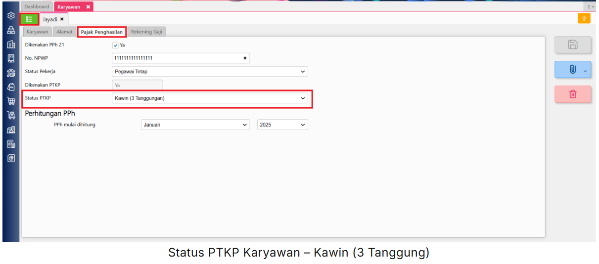 - kemudian, cek untuk status PTKP pada karyawan dengan cara ke menu perusahaan | karyawan | daftar karyawan, dan lakukan pencarian atas data karyawan yang dimaksud, lalu ke tab Pajak Penghasilan. Pada ilustrasi untuk Status PTKP karyawan adalah K3 (Kawin (3 Tanggunga)).