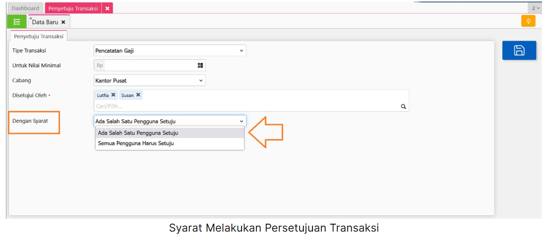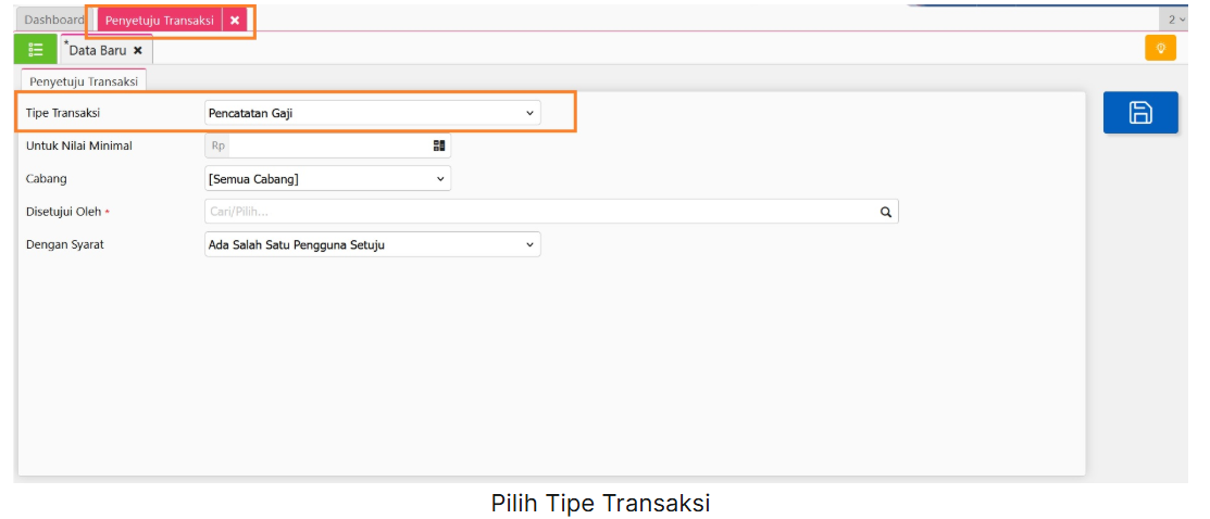 Setelah semua diisi, klik Simpan. Anda juga bisa lanjut mengatur persetujuan untuk tipe transaksi lainnya sesuai kebutuhan.