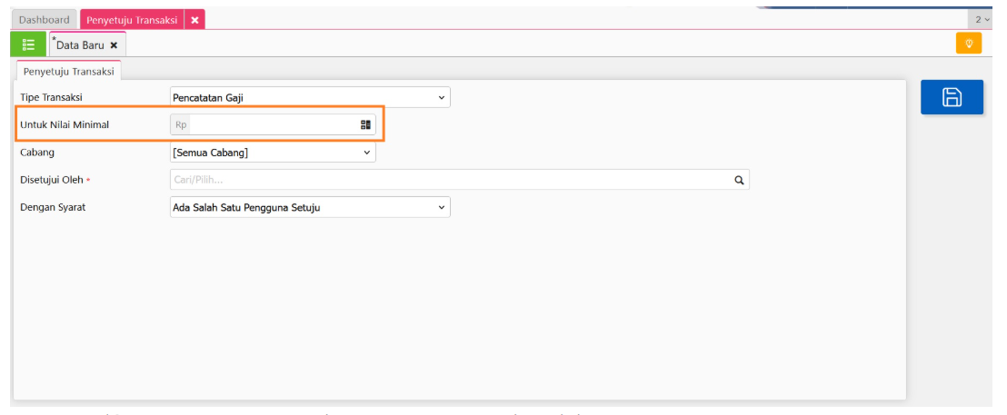 Jika hanya transaksi di atas nilai tertentu yang perlu persetujuan, isi bagian “Untuk Nilai Minimal”. Jika semua transaksi wajib disetujui, biarkan bagian ini kosong.